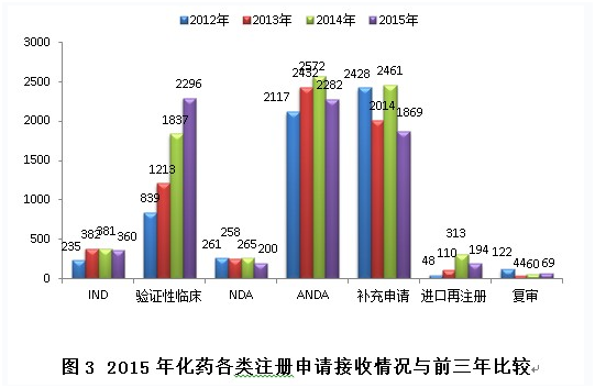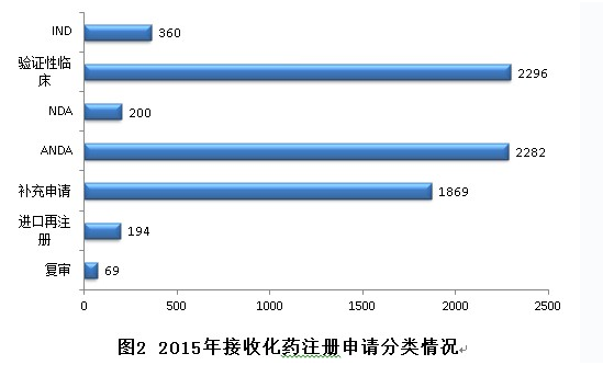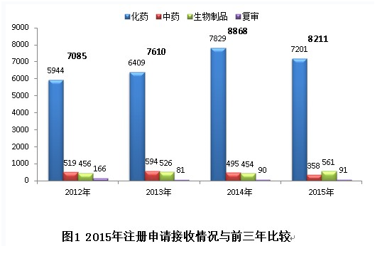 2015年,藥審中心全年接收新注冊申請8211個(以受理號計,下同)。與既往年度接收注冊申請的比較情況見圖1。