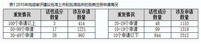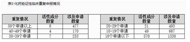 截至2015年底,待審的化藥驗證性臨床申請共3590個,占待審任務(wù)總量的20.8%,涉及活性成分660個。重復(fù)申報較嚴重的有40個活性成分(待審任務(wù)量均在20個受理號以上),涉及注冊申請1393個,占化藥驗證性臨床總?cè)蝿?wù)量的38.8%。其中相同活性成分待審任務(wù)超過50個的有沃替西汀、阿普斯特、阿考替胺、曲格列汀、阿伐那非、阿法替尼、阿齊沙坦、卡格列凈。