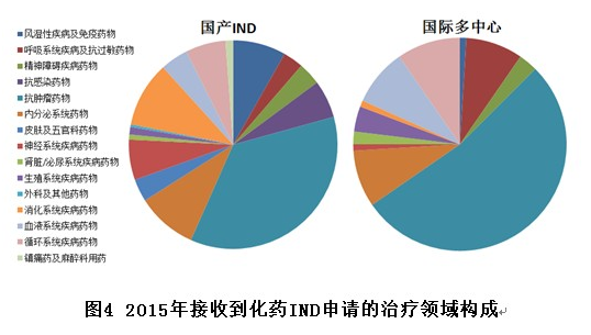 國產(chǎn)IND申報數(shù)量較多的治療領(lǐng)域有:抗腫瘤藥物、消化系統(tǒng)疾病藥物、內(nèi)分泌系統(tǒng)藥物、風濕性疾病及免疫藥物。國際多中心(含進口IND)申報數(shù)量較多的治療領(lǐng)域主要集中在抗腫瘤藥物。