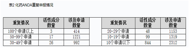 截至2015年底,待審的化藥ANDA申請共7411個,占待審任務(wù)總量的42.9%,涉及活性成分1027個。重復(fù)申報較嚴重的有94個活性成分(待審任務(wù)量均在20個受理號以上),涉及注冊申請3780個,占化藥ANDA總?cè)蝿?wù)量的51%。其中相同活性成分待審任務(wù)超過100個的有埃索美拉唑鈉、恩替卡韋、法舒地爾,其中埃索美拉唑鈉和恩替卡韋兩個活性成分2015年的新申請量仍位列前茅。