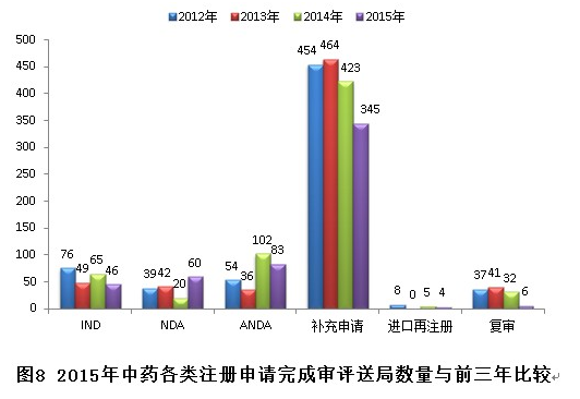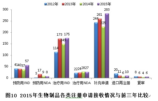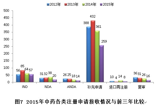 2015年,新接收中藥注冊申請共374個,各類注冊申請接收情況與前三年比較見下圖: