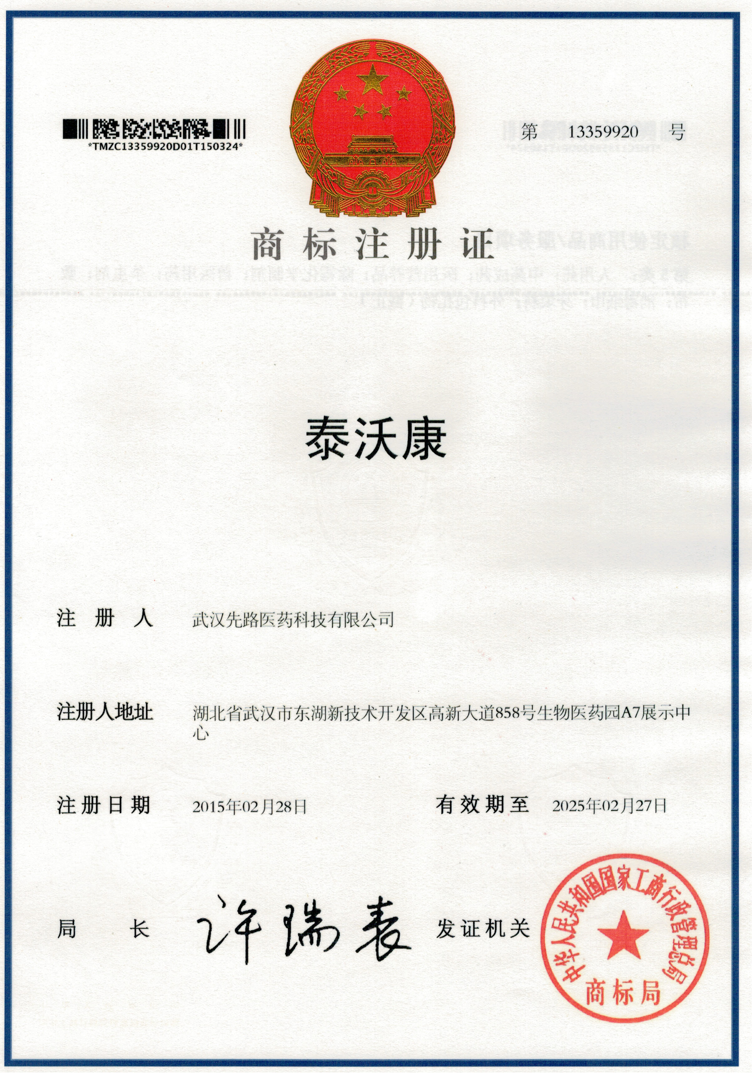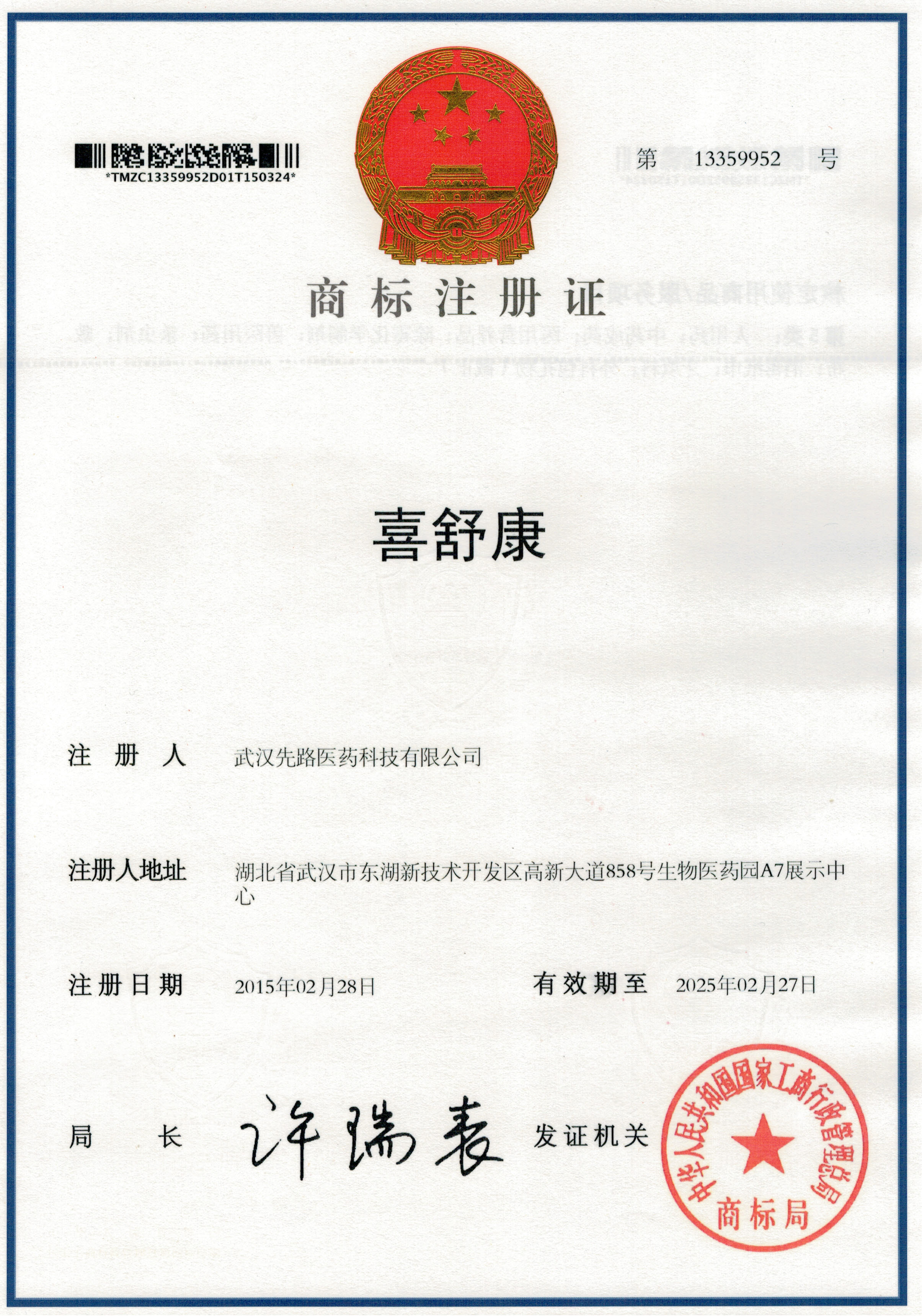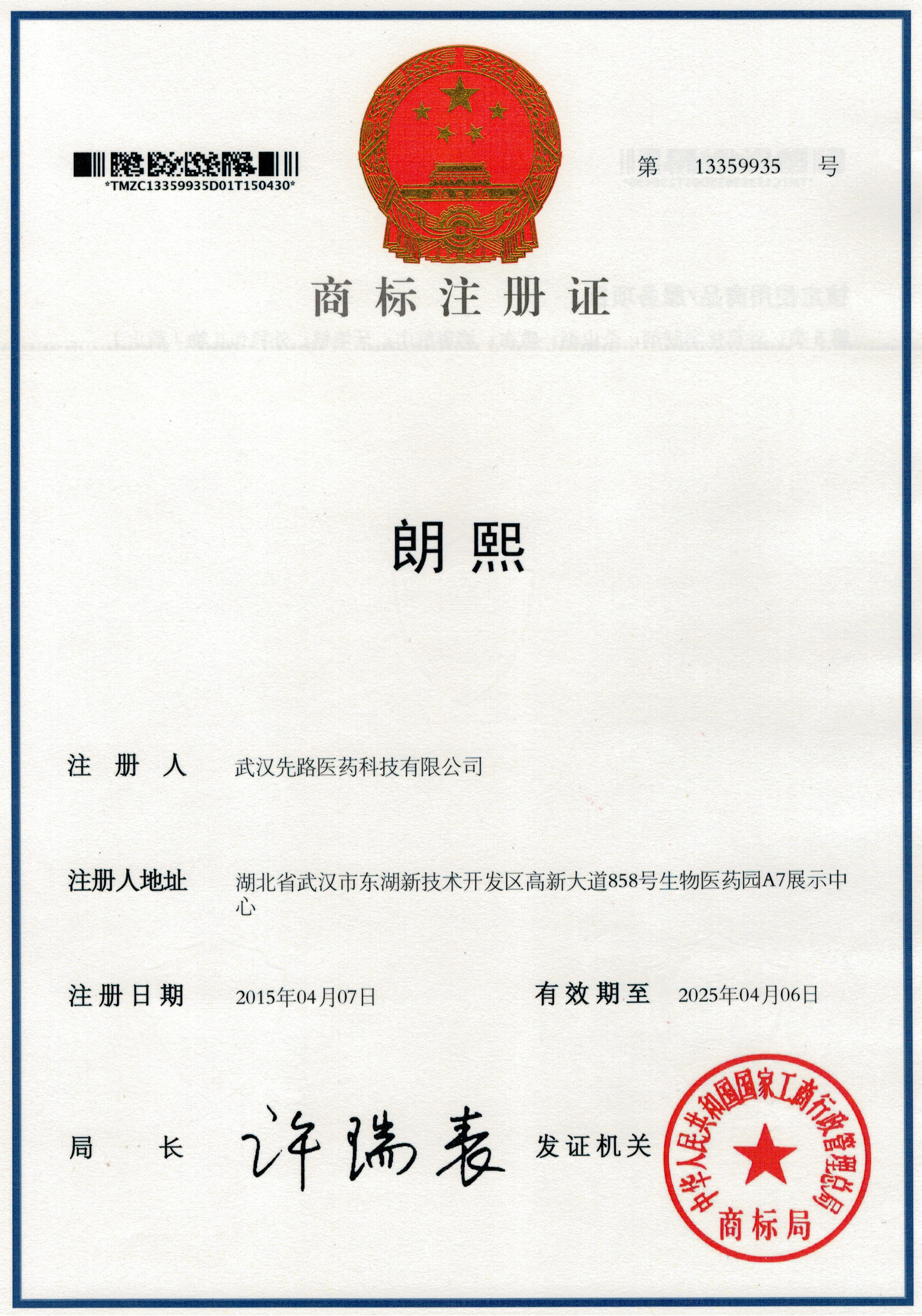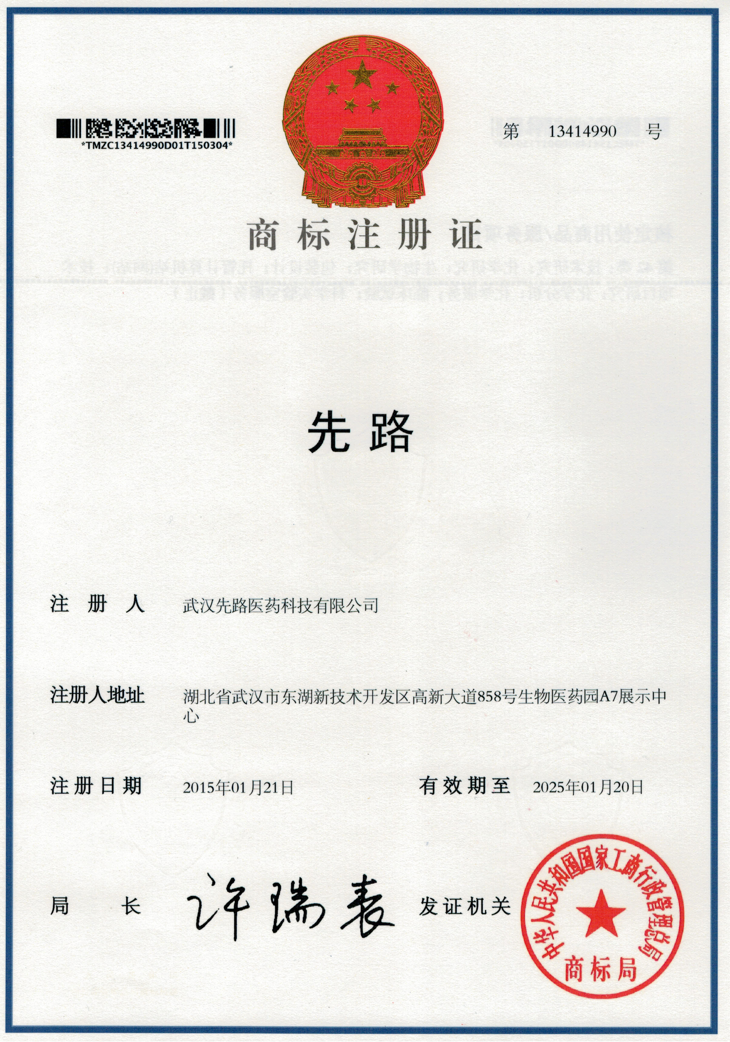 武漢先路醫(yī)藥科技股份有限公司于近日收到國家工商行政管理總局商標(biāo)局頒發(fā)的商標(biāo)注冊證書4項,具體情況如下: