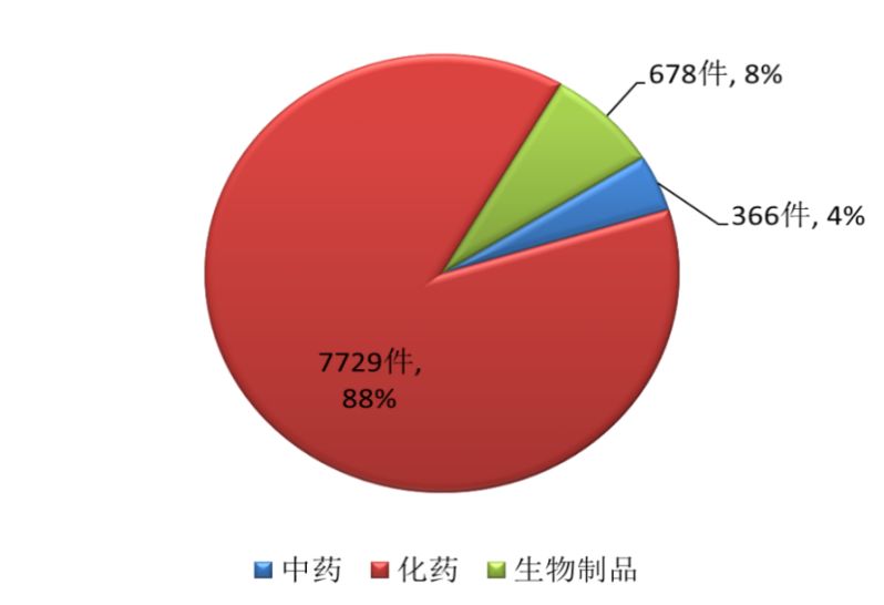 完成審評(píng)的申請(qǐng)中,化藥注冊(cè)申請(qǐng)為7729件,約占全部審評(píng)完成量的88%。各類藥品注冊(cè)申請(qǐng)審評(píng)完成情況詳見圖2。