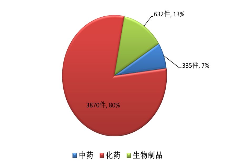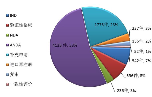 藥審中心完成審評(píng)的化藥注冊(cè)申請(qǐng)7729件,其中完成化藥ANDA 4135件,占化藥審評(píng)完成量的53%,基本解決了仿制藥注冊(cè)申請(qǐng)積壓的問題。完成審評(píng)的化藥各類注冊(cè)申請(qǐng)情況詳見圖4。