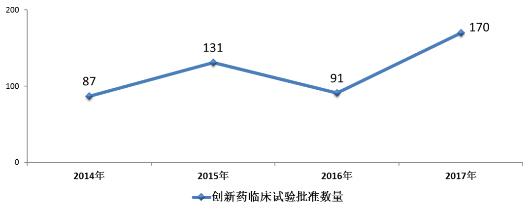 圖8 2017年化藥創(chuàng)新藥臨床試驗(yàn)批準(zhǔn)數(shù)量與前三年比較(以品種計(jì))(注:化藥創(chuàng)新藥注冊(cè)申請(qǐng)是指按照《藥品注冊(cè)管理辦法》(原國家食品藥品監(jiān)督管理局令28號(hào))附件2的要求申報(bào)的化藥1.1類的注冊(cè)申請(qǐng)及按照總局《關(guān)于發(fā)布化學(xué)藥品注冊(cè)分類改革工作方案的公告》(2016年第51號(hào))附件1要求申報(bào)的化藥1類的注冊(cè)申請(qǐng),為境內(nèi)外均未上市的全球新藥物,不包括改良新藥物;此次統(tǒng)計(jì)未納入進(jìn)口原研藥臨床試驗(yàn)申請(qǐng)及國際多中心臨床試驗(yàn)申請(qǐng),下同。)