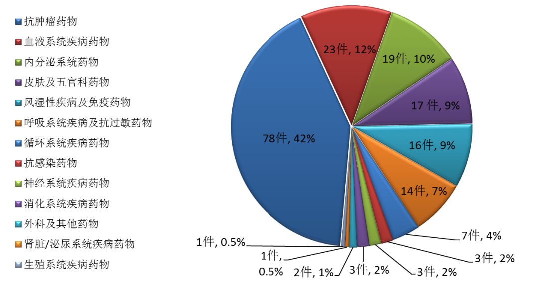 藥審中心接收進(jìn)口藥新藥注冊(cè)申請(qǐng)259件(涉及133個(gè)品種),其中接收5.1類進(jìn)口原研藥注冊(cè)申請(qǐng)117件(涉及70個(gè)品種),1類進(jìn)口創(chuàng)新藥注冊(cè)申請(qǐng)75件(涉及37個(gè)品種),接收進(jìn)口藥國際多中心臨床申請(qǐng)67件(涉及26個(gè)品種),創(chuàng)新藥的適應(yīng)癥主要集中在抗腫瘤、抗感染領(lǐng)域。