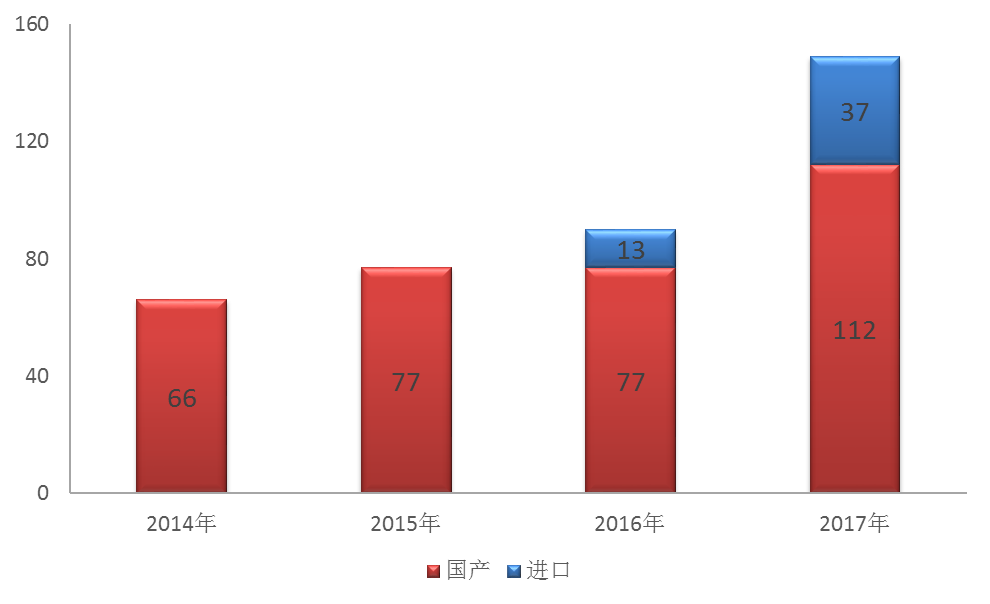 藥審中心接收化藥創(chuàng)新藥注冊(cè)申請(qǐng)149個(gè)品種,較2016年增長(zhǎng)了66%,其中接收國產(chǎn)化藥創(chuàng)新藥注冊(cè)申請(qǐng)112個(gè)品種,進(jìn)口創(chuàng)新藥注冊(cè)申請(qǐng)37個(gè)品種,2014年- 2017年創(chuàng)新藥注冊(cè)申請(qǐng)接收情況詳見圖16。