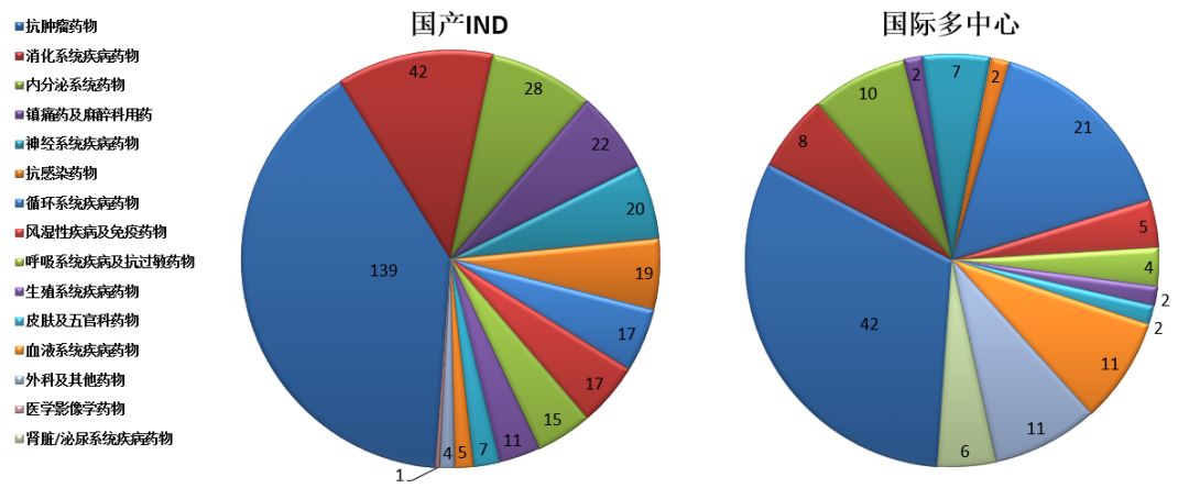 藥審中心接收化藥IND申請(qǐng)480件,其中接收國產(chǎn)化藥IND申請(qǐng)347件,接收國際多中心臨床試驗(yàn)申請(qǐng)133件。國產(chǎn)化藥IND申請(qǐng)接收量較多的治療領(lǐng)域?yàn)榭鼓[瘤藥物、消化系統(tǒng)疾病藥物和內(nèi)分泌系統(tǒng)藥物。國際多中心臨床試驗(yàn)申請(qǐng)接收量較多的治療領(lǐng)域?yàn)榭鼓[瘤藥物、循環(huán)系統(tǒng)疾病藥物和血液系統(tǒng)疾病藥物,具體治療領(lǐng)域分布詳見圖17。