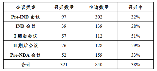 藥審中心收到溝通交流會(huì)會(huì)議申請(qǐng)共840件,總體召開率為38%。其中Pre-IND會(huì)議和II期后會(huì)議召開數(shù)量較多,共召開173場(chǎng),占全年溝通交流會(huì)議召開總量的54%。各類溝通交流會(huì)議召開情況詳見表5。