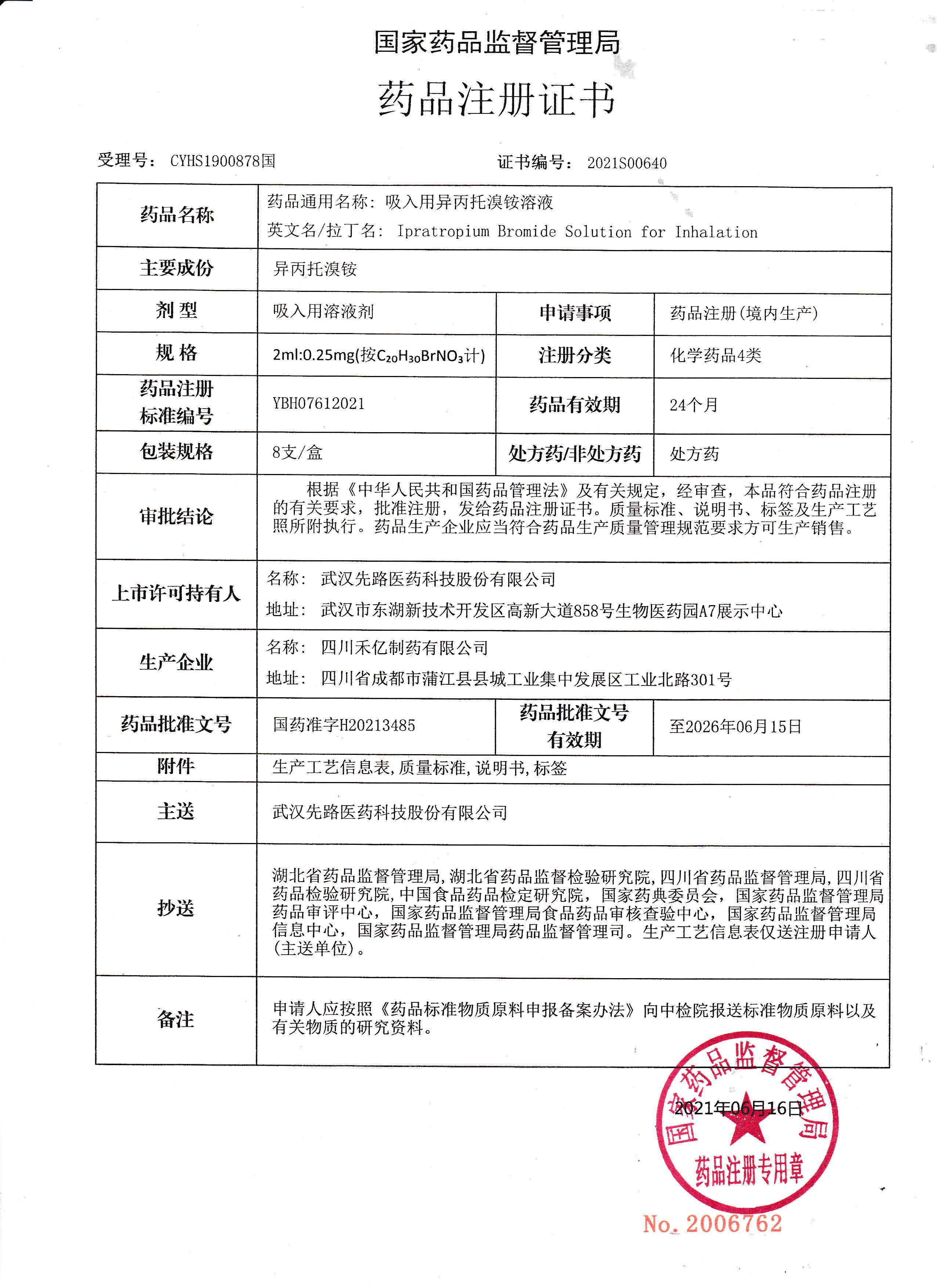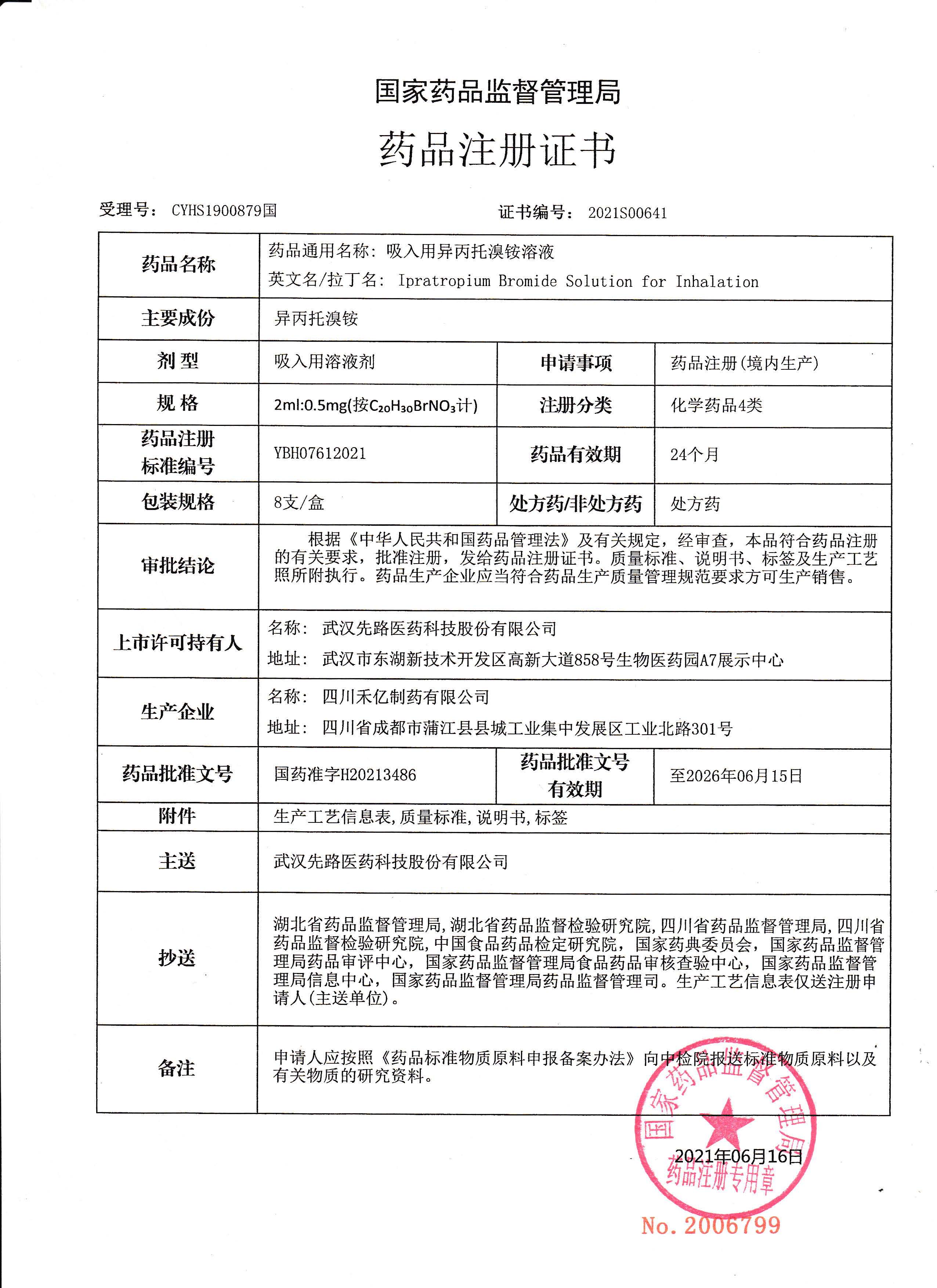 2021年6月16日,先路醫(yī)藥申報(bào)的4類(lèi)仿制藥“吸入用異丙托溴銨溶液”獲得國(guó)家藥品監(jiān)督管理局藥品注冊(cè)證書(shū)。